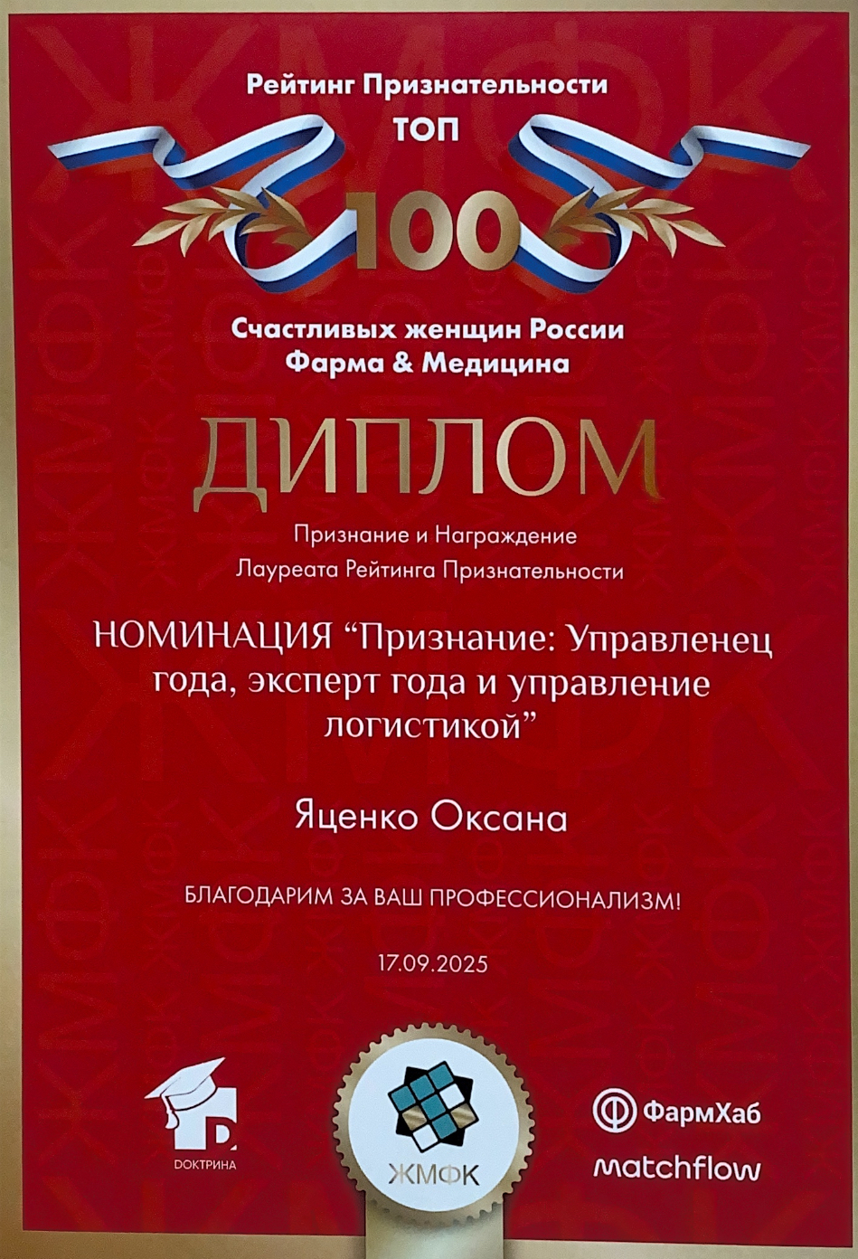 Оксана получила диплом в номинации "Признание: Управленец года, эксперт года и управление логистикой".